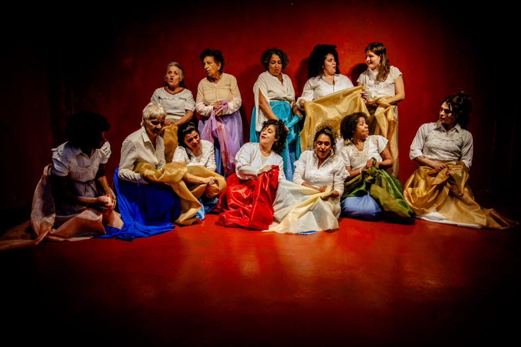 “Esse coral poderoso, com uma equipe artística grande ao redor – é composto por pessoas com diferentes idades, com variadas experiências em teatro, vindas de diferentes territórios, numa diversidade étnico racial e de gênero – enfrentando a beleza do desafio de formar um coro. Quisemos evocar a coletividade, trazendo o sentido de uma rede, de uma aliança, de uma força, de um certo sentido de comunitarismo, porque é uma história de opressão”, conta Patricia.